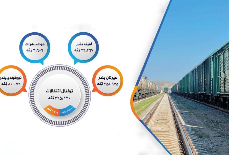بر اساس اطلاعات اداره راه آهن، 258 هزار و 975 تن از طریق بندر هریتان، 22 هزار و 467 تن از طریق بندر عقینه، 2 هزار و 3606 تن از طریق بندر خواف – هرات و 80072 تن از طریق بندر تورغندای که در مجموع 365 هزار و 120 تن است.