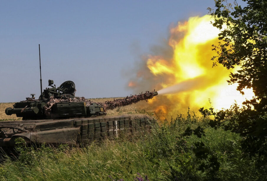 Ukrainian servicemen fire with a tank towards Russian troops near a front line, amid Russia's attack on Ukraine, in Kharkiv region, Ukraine July 6, 2023. REUTERS/Vyacheslav Madiyevskyy