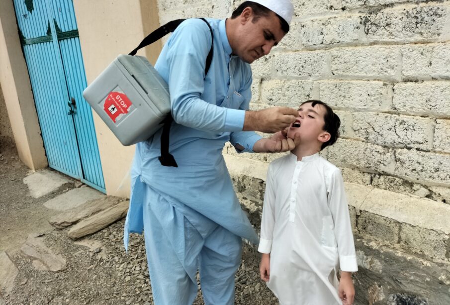 فایل فوټو: مجاهد شاه شینواري، چې د پولیو کمپاین کارکوونکې وو، په لنډي کوتل سیمه کښې ماشومانو ته د پولیو څخه د ژغورنې قطرې ورکوي.