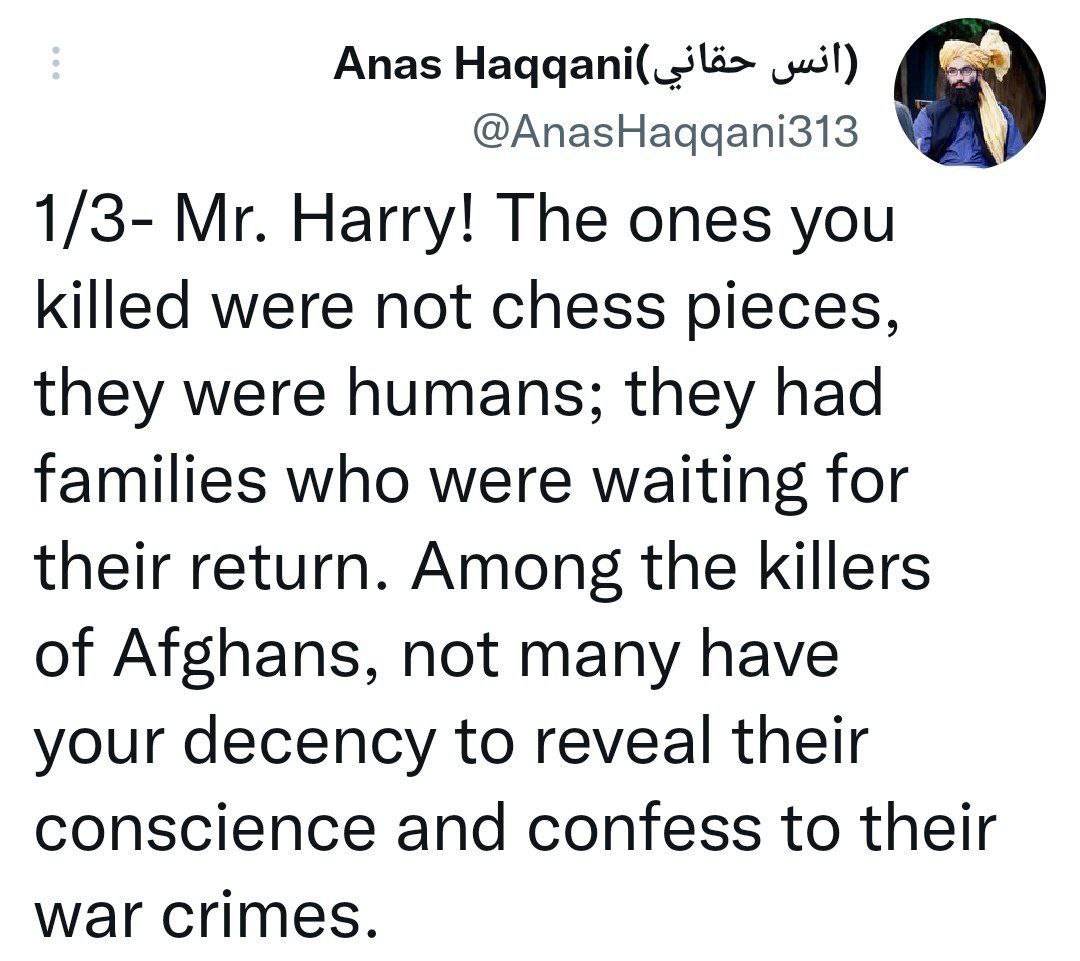 حقانی به جواب شهزاده هری: شما در این جنگ “مغلوب” شدید و امیدوارم که تاریخ بشریت این “جنایتها” را به یاد داشته ...شهزاده سلطنت بریتانیا اعتراف کرد که ۲۵ شهروند افغان را در جریان ماموریش کشته است